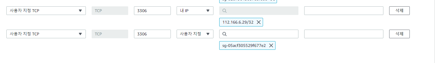 -> 복사된 보안 그룹 ID와, 본인의 IP를 RDS보안 그룹의 인바운드로 추가 (규칙 유형은MYSQL/Aurora)